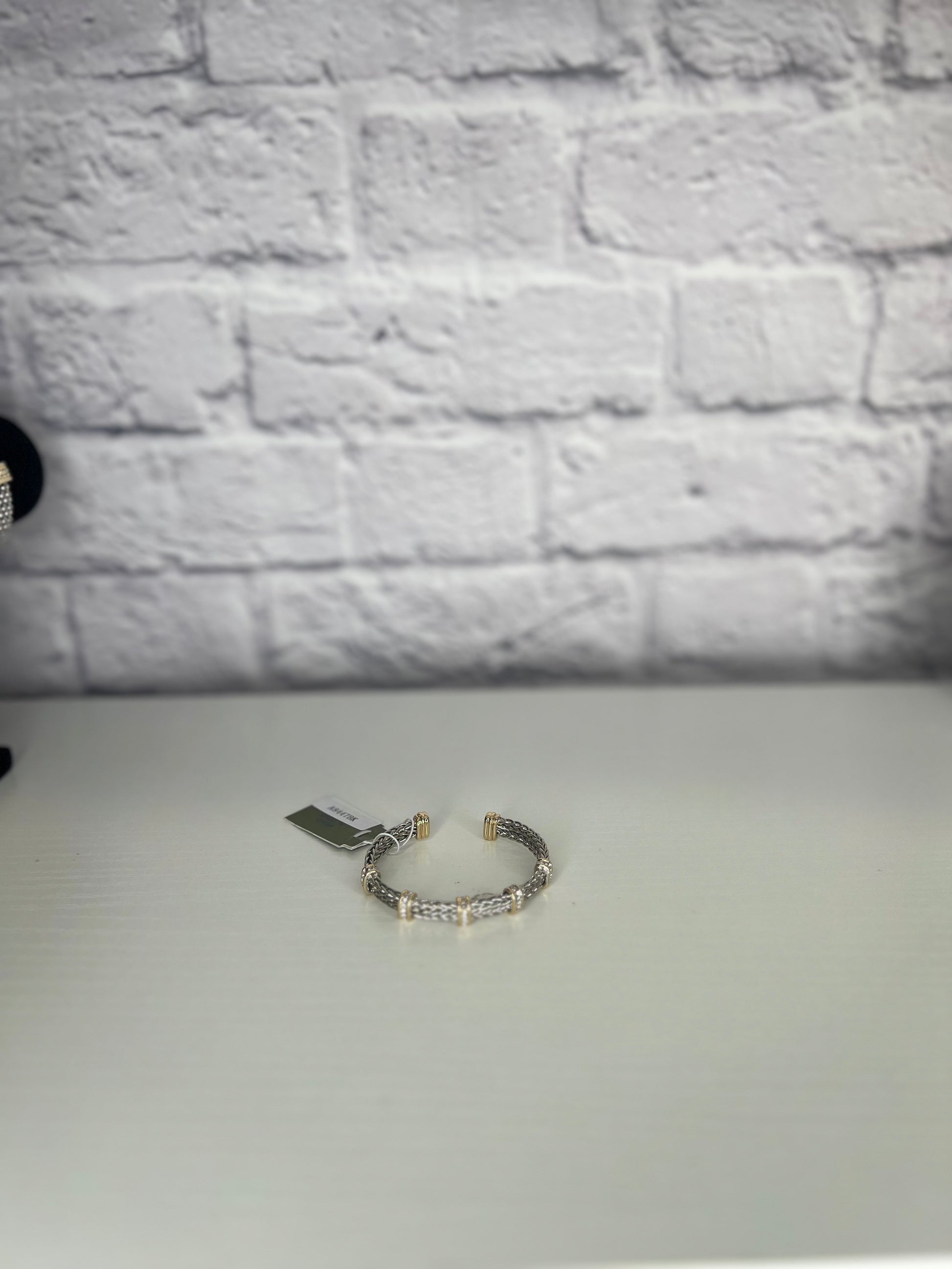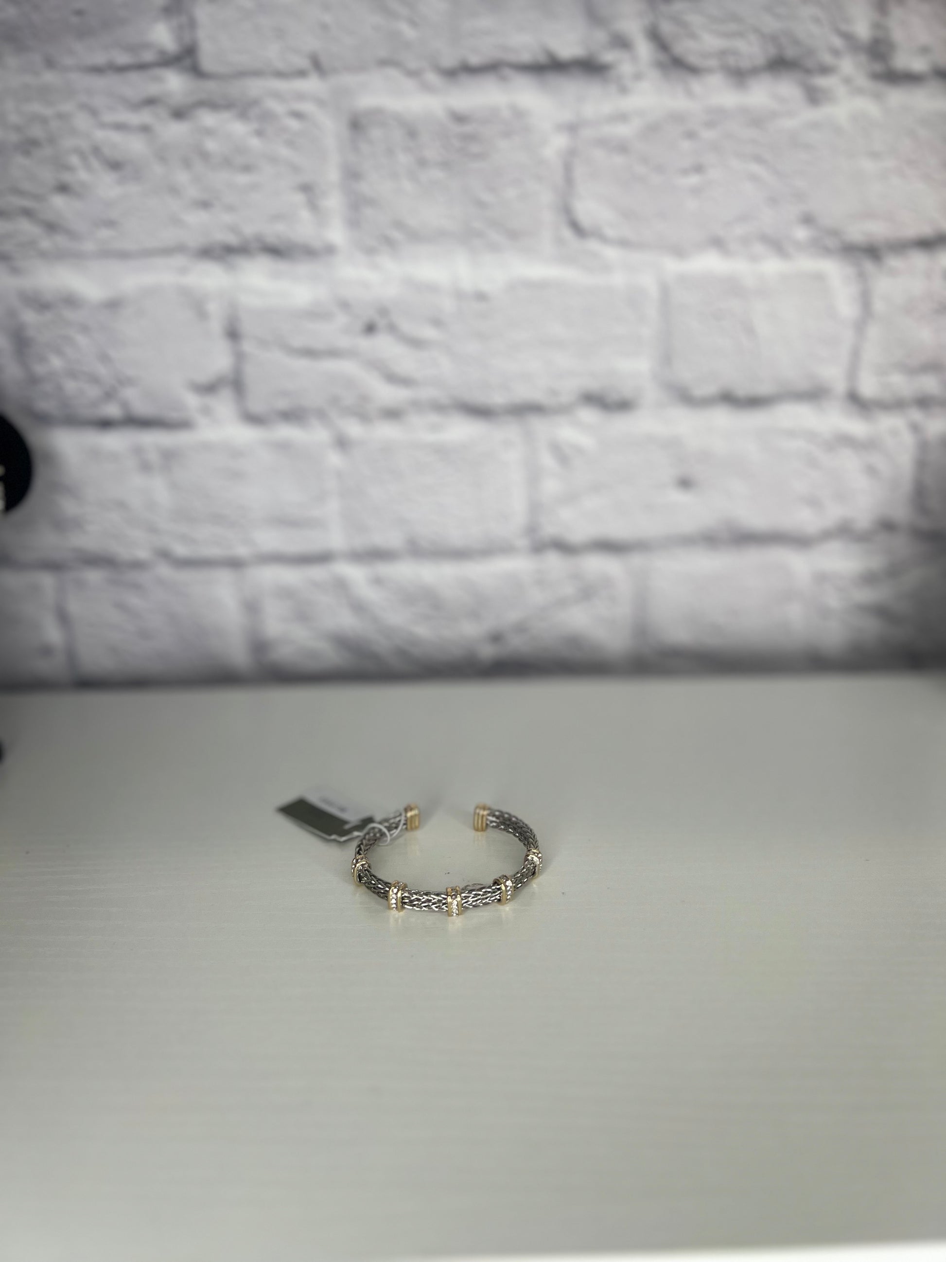 The Eternal Elegance Cuff is a refined expression of timeless sophistication. Featuring a woven silver-tone band, this open cuff is beautifully accented with gold-tone stations and pavé crystal detailing, creating a stunning contrast of texture and shine.