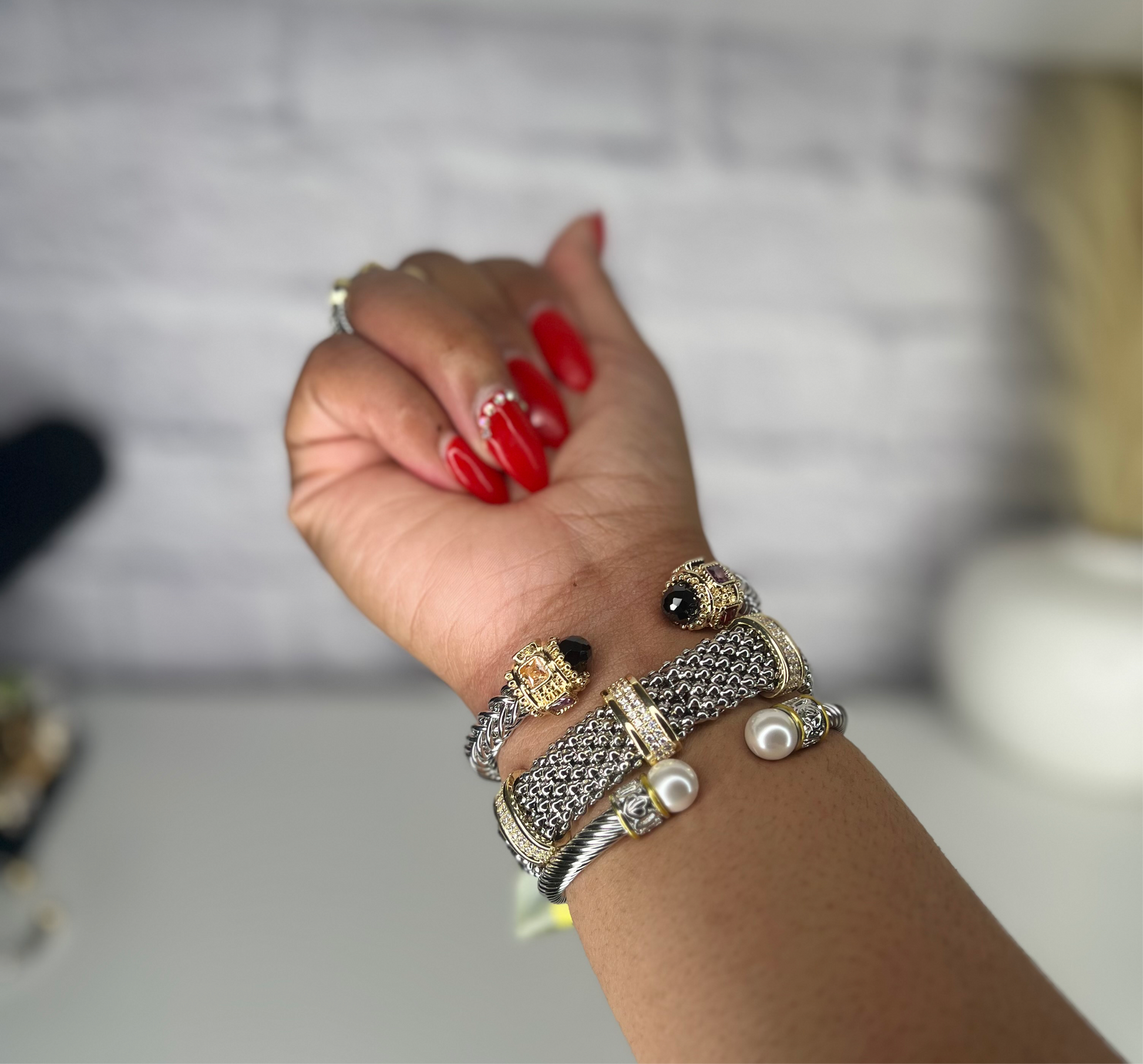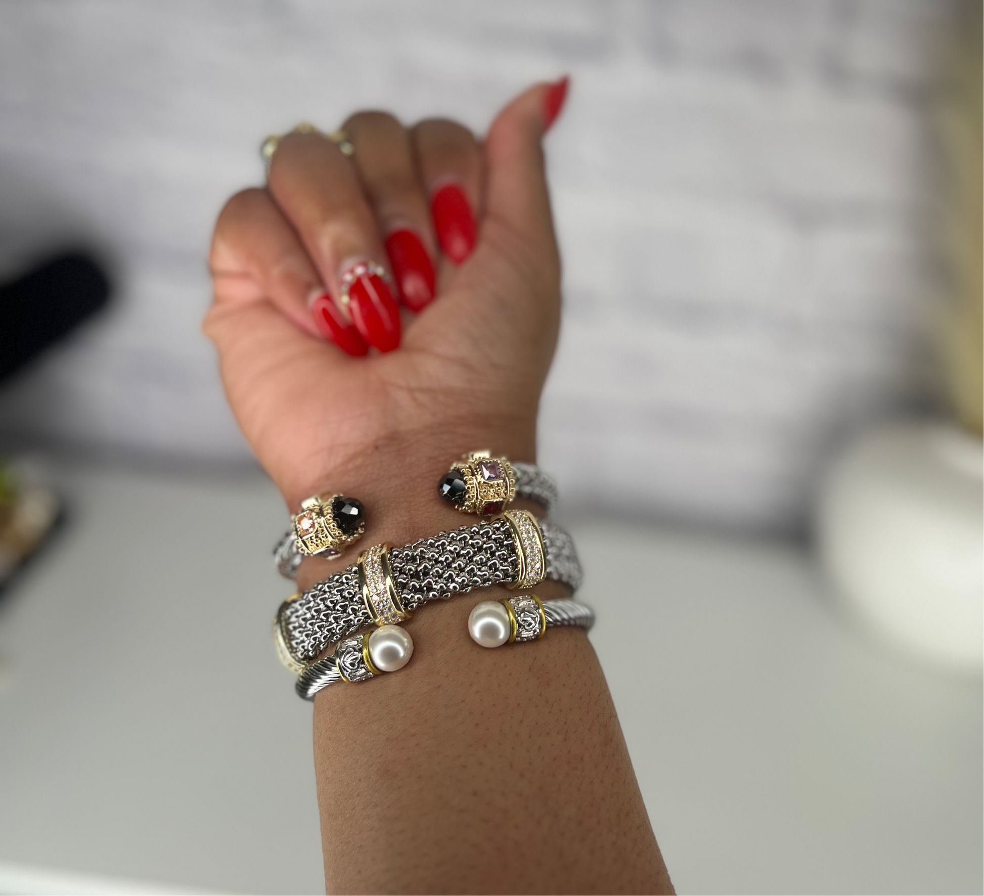 A striking combination of bold textures, rich gemstones, and classic pearls, the Grandeur Stack is designed for those who love to exude confidence and elegance in every look. Perfect for stacking or wearing individually for a versatile, timeless aesthetic.