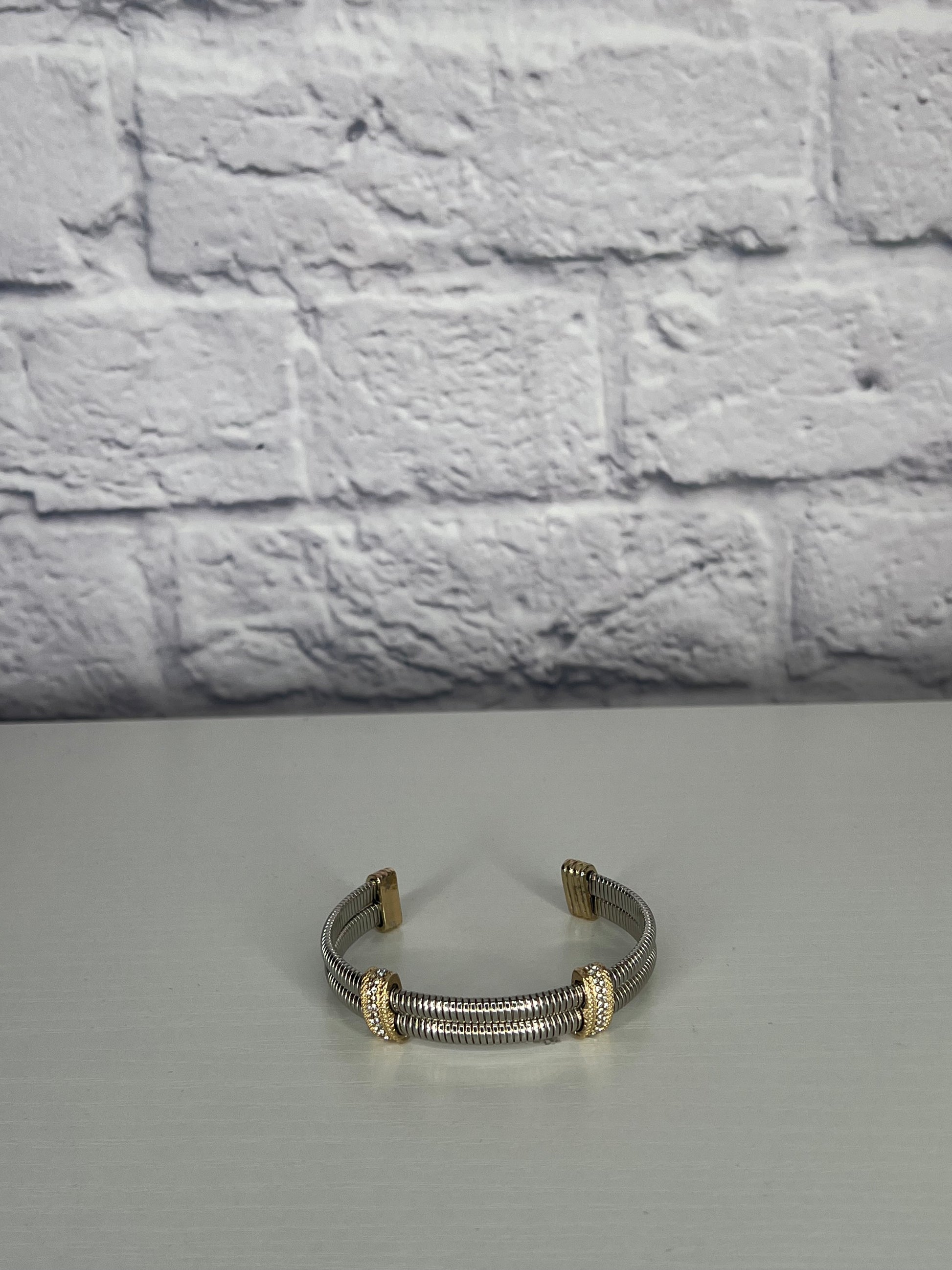 The Lustrous Harmony Cuff is a stunning blend of modern sophistication and classic elegance. Designed with a sleek silver-tone coil band, this open cuff is adorned with gold-tone pavé-encrusted accents, adding just the right amount of shimmer and refinement.